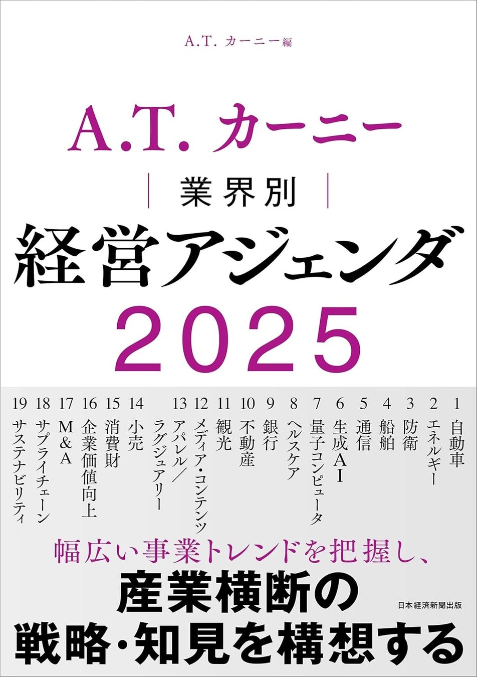 経営コンサルティング会社A.T. カーニー(グローバル・ブランド名はKEARNEY、東京都港区、日本代表:関灘 茂)編著による 「A.T. カーニー 業界別経営アジェンダ2025」 が11月13日、日本経済新聞出版より発売されます。