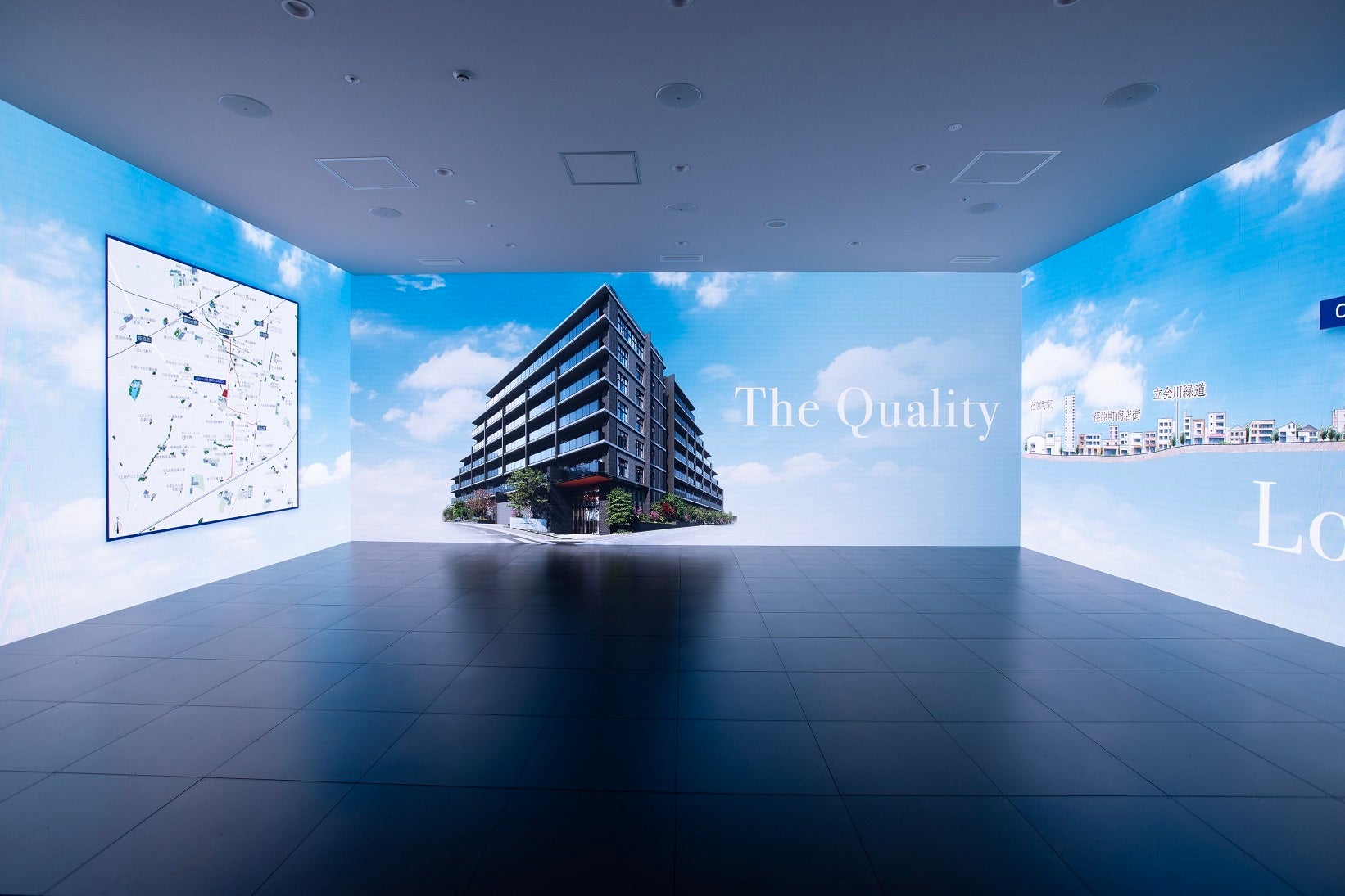 また、同じスクリーンを活用し、3Dの外観模型やエントランスホール等の共用部もVRで投影することにより、実際のマンション全体の雰囲気も想像できる空間としています。