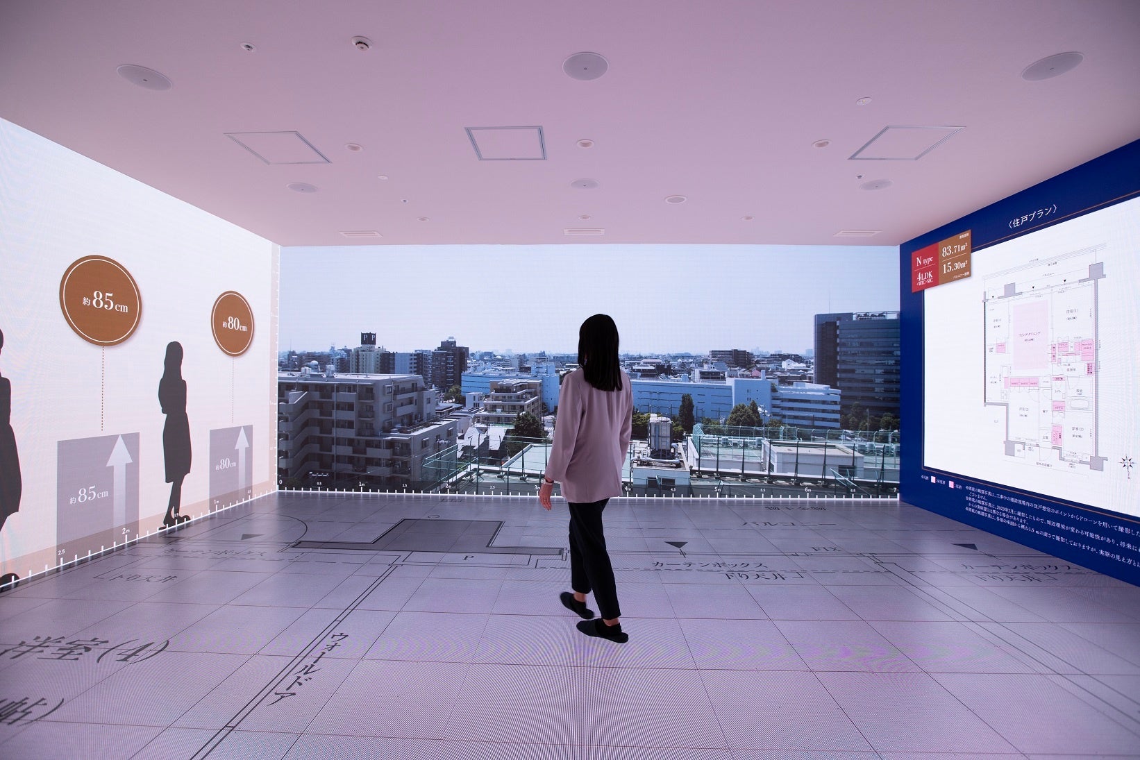 「ギャラリークレヴィア有楽町イトシア」のLEDスクリーンルームには、壁3面および床面に大型のLEDスクリーンを配置し、全ての販売住戸の図面、および一部プランのVRモデルルームを投影することで、お客様が購入検討されるプランを、より具体的にイメージすることができる空間としました。壁面と床面の4面に映像を投影することで、あたかも実際の部屋にいるような没入感を体感いただけます。投影する図面は、操作用タブレットと連動しており、タブレットで画面をスクロールすると、投影している床面の図面もスライドでき、図面全体を確認することができます。
