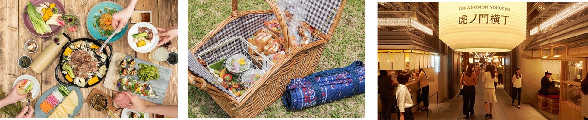 「Meet up @ TORANOMON HILLS」の期間中、虎ノ門ヒルズカフェのテラス席では開放的な雰囲気の中、アジア各国の調味料をふんだんに使用したモダンチャイニーズバーベキュー「虎ノ門ヒルズバーベキュー2022」をお楽しみいただけます。また、ボリューミーなサンドイッチや彩り鮮やかなフルーツ、虎ノ門ヒルズカフェオリジナルのサラダなどを、オーバル広場のオープンスペースでお楽しみいただけるオリジナルピクニックBOXも用意しました。