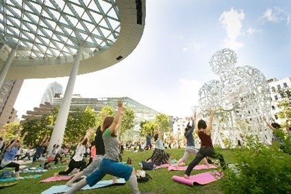 都心の中に緑と青空が広がるオーバル広場で虎ノ門ヒルズヨガを開催。アシックスの先端技術を体験できるASICS Sports Complex TOKYO BAYから講師を迎え、運動レベルも選べる豊富なプログラムをご用意。休日の朝活として、仕事終わりのリラックスタイムとして、充実の時間をお届けします。