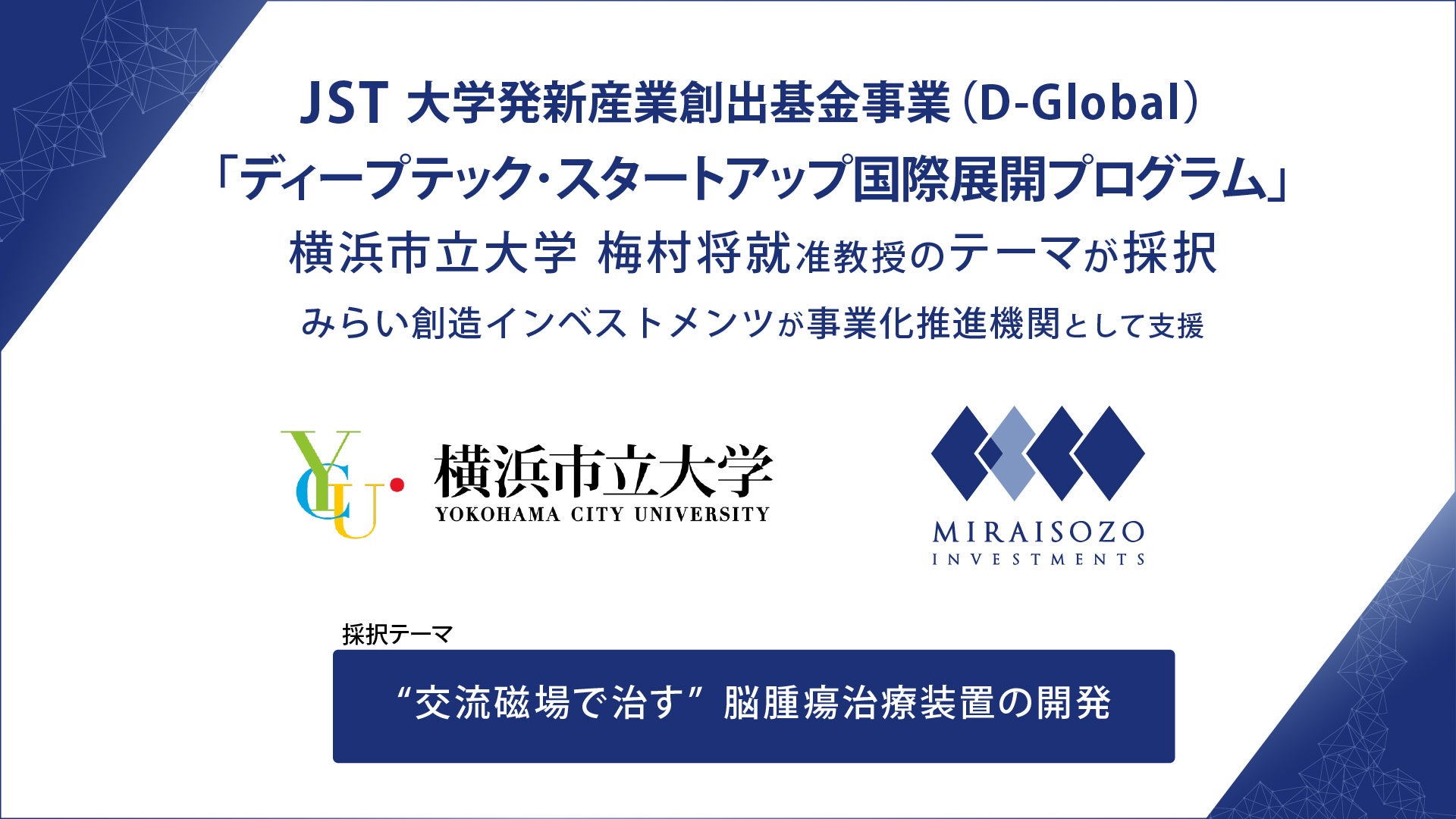 横浜市立大学(学長:石川義弘) 医学部 循環制御医学 梅村将就 准教授らの研究グループと、株式会社みらい創造インベストメンツ(代表取締役社長:岡田祐之)が共同代表者として申請したテーマ「 “交流磁場で治す”脳腫瘍治療装置の開発」が、このたび科学技術振興機構(JST)「ディープテック・スタートアップ国際展開プログラム(D-Global)」に採択されました。本テーマは、みらい創造インベストメンツが事業化推進機関として伴走し、技術の事業化およびスタートアップ創業を目指します。