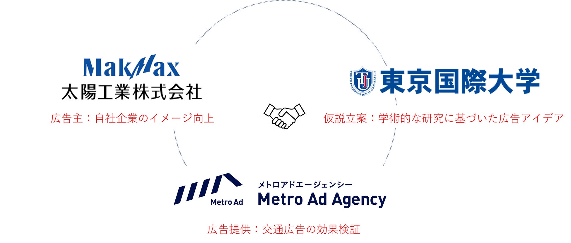 本研究は、東京国際大学商学部平木ゼミが仮説立案から調査を担当し、広告主として太陽工業、広告媒体の提供および全体プロデュースを担うメトロアドエージェンシーと連携することで実現しました。