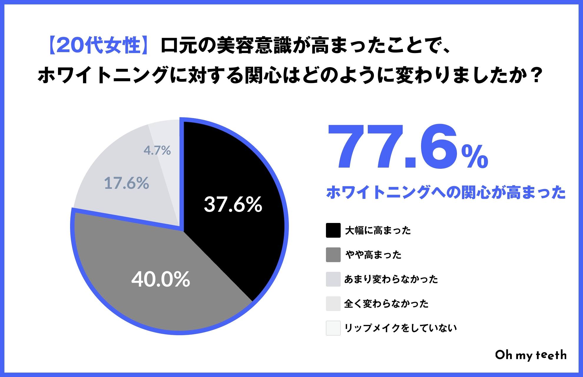 口元の美容意識の高まりによる、歯のホワイトニングに対する関心の変化について聞くと、約70%の女性が「大幅に高まった」と「やや高まった」と回答。特に20代の女性では、この傾向が際立っており、77.6%が関心が「高まった」と回答。見た目の美しさと健康に対する意識が高まるにつれ、ホワイトニングへの関心も増加していることが伺えた。