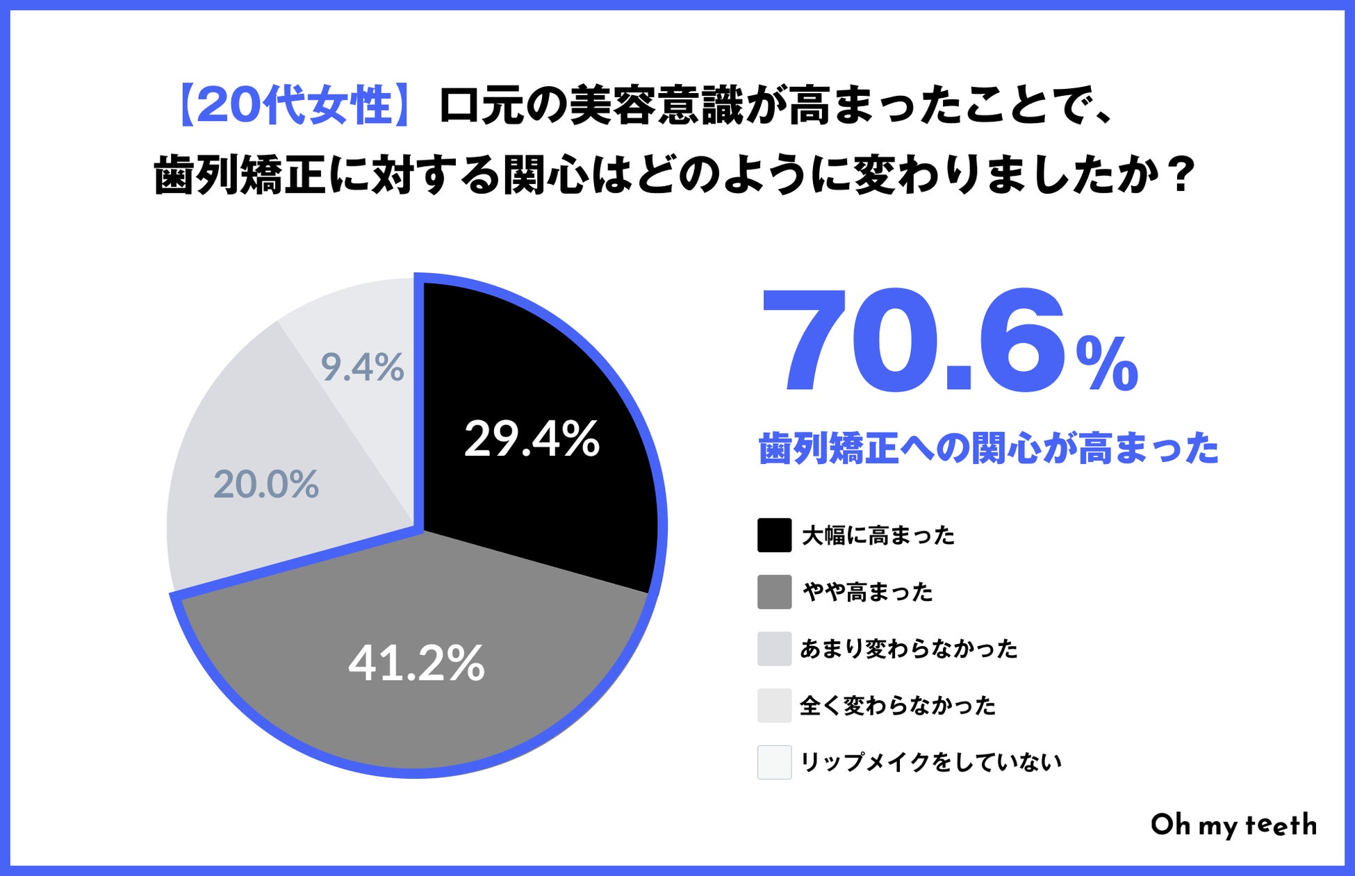口元の美容意識の高まりによる、歯列矯正に対する関心の変化について聞くと、約53%の女性が「大幅に高まった」と「やや高まった」と答えた。特に20代では、ホワイトニング同様に歯列矯正に対する関心も高く、約71%が関心が高まったと回答。脱マスクにより、若い世代の間で口元の美しさに対する意識が高まる様子が見られた。
