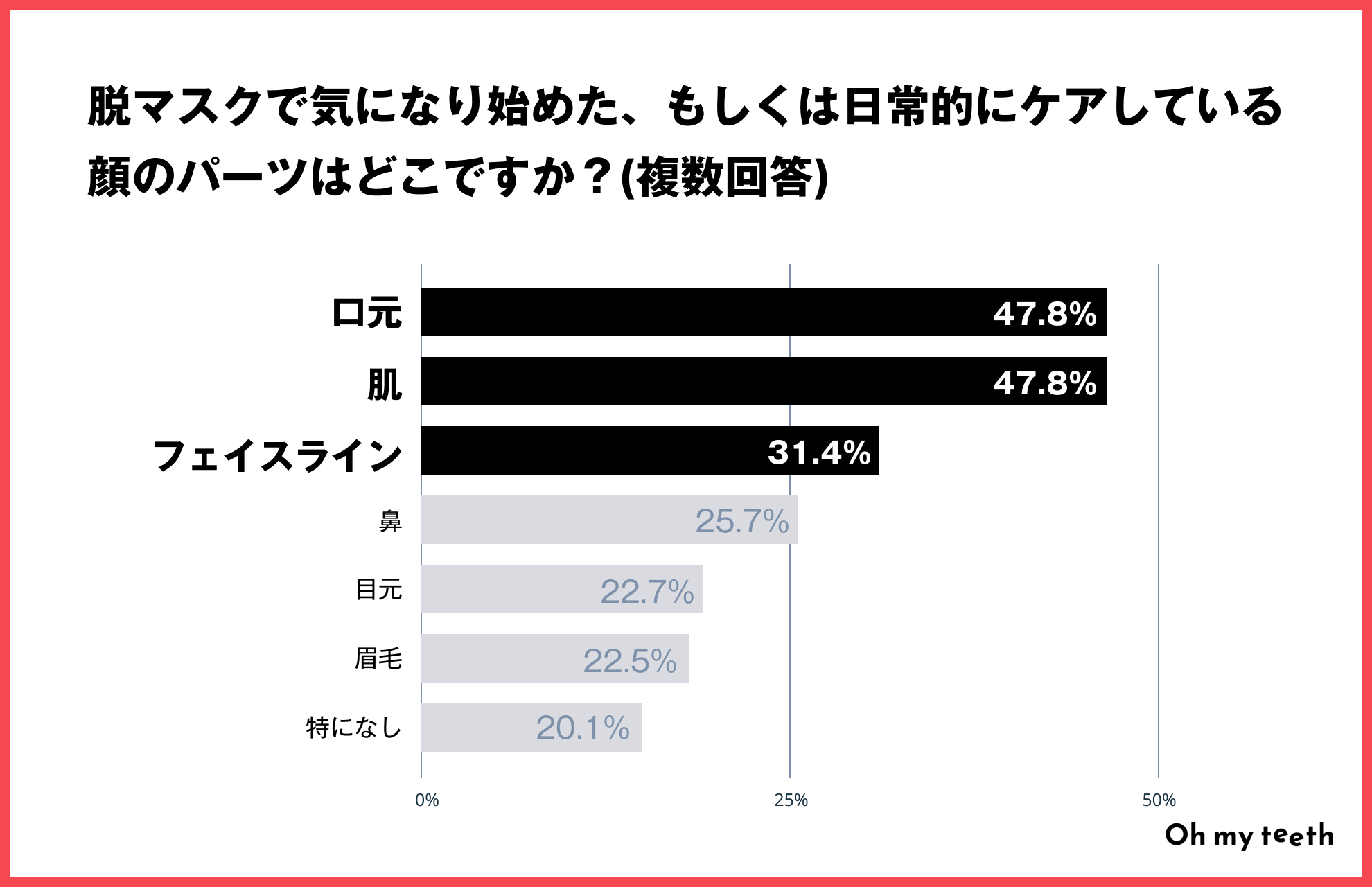 脱マスクで気になり始めた、もしくは日常的にケアしている顔のパーツについて聞いたところ、同率1位で「口元(47.8%)」「肌(47.8%)」、次いで3位が「フェイスライン(31.5%)」という結果に。長期間マスク着用によって隠されていた口元やフェイスラインがあらわになることで、口元に対する意識が高まっている様子が明らかとなった。