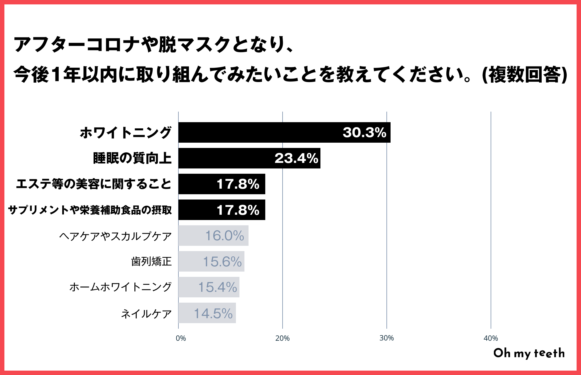 アフターコロナやマスク緩和となり、今後1年以内に取り組んでみたいことを聞いたところ、「特に取り組んでみたいことはない」に次いで、「ホワイトニング(30.3%)」、「睡眠の質向上(23.4%)」、「エステ等美容に関すること(17.8%)」という結果に。