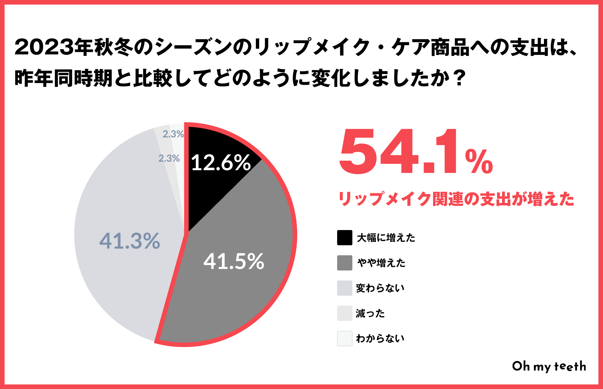 また、2023年秋冬シーズンにおけるリップメイク・ケア商品への支出に関しては、54.1%の回答者が昨年より「大幅に増えた」または「やや増えた」回答。昨年同時期と比較して支出が増加していることから、実際の消費行動にも変化が見られた。