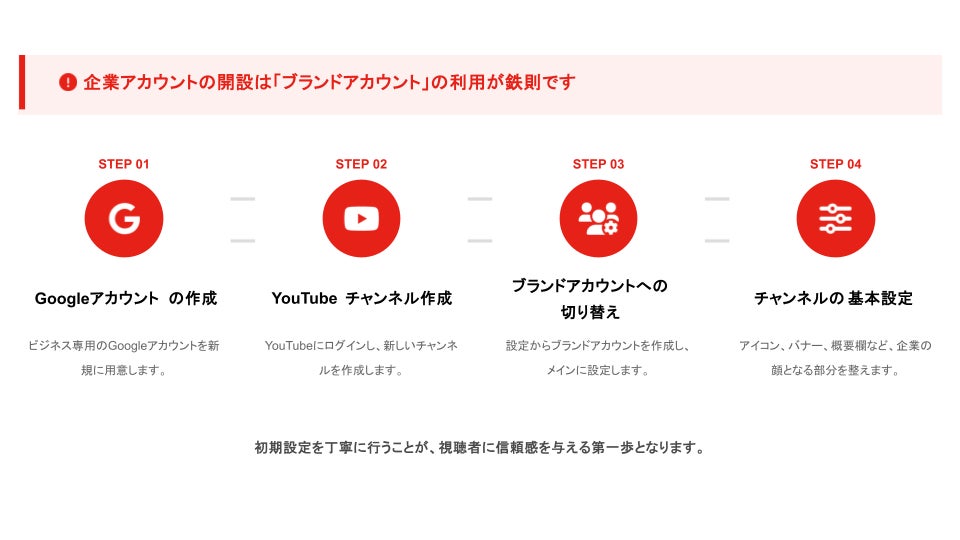 企業アカウントの開設は、個人のチャンネル開設と手順が少し異なり、ブランドやビジネスの名前でチャンネルを管理できる「ブランドアカウント」の利用が推奨されます。