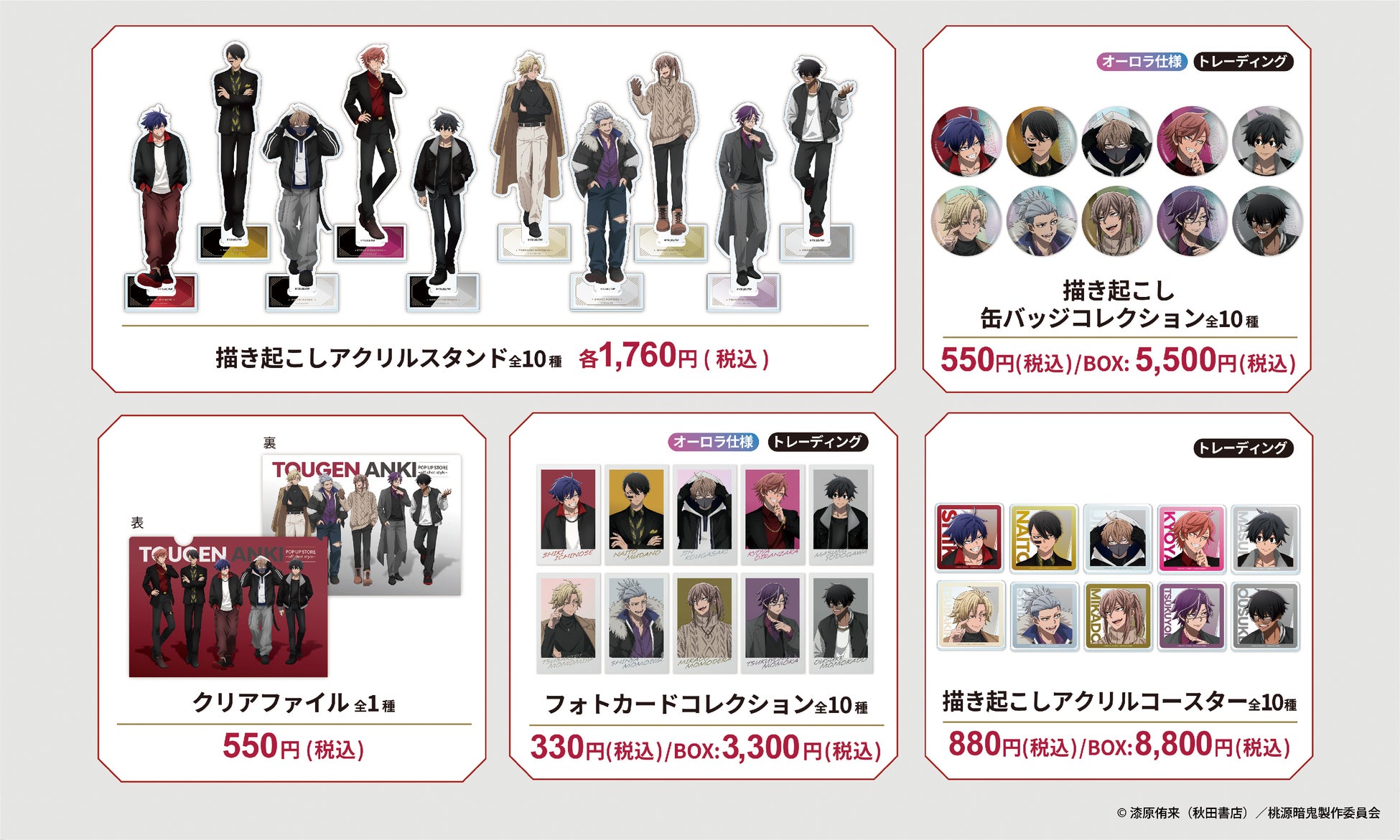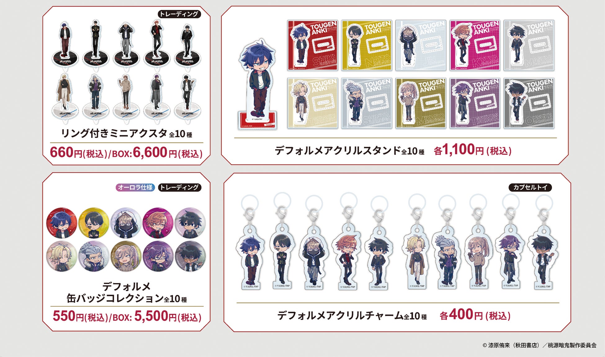本イベントは、TVアニメ『桃源暗鬼』のキャラクターの「オフのひととき」をテーマとしたポップアップストアです。総勢10キャラクターの新規描き起こしイラストを使用したアクリルスタンドや缶バッジ、またデフォルメイラストや場面写を使用したグッズなどの新商品を販売します。