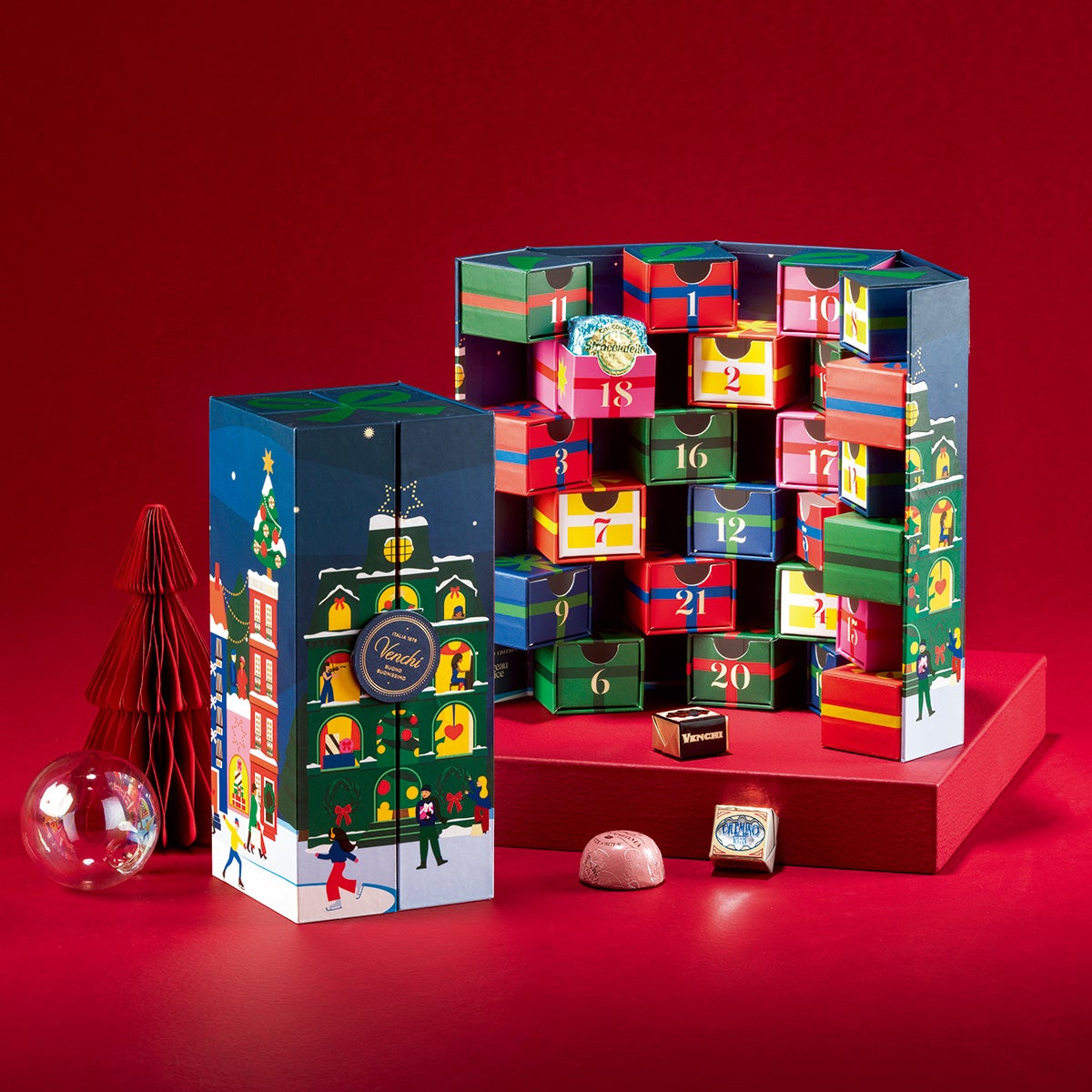 クリスマスで華やぐ街の様子が描かれたデザインは、見ているだけでホリデー気分を盛り上げてくれます。箱を開くと魔法のように現れる24個の小さな引き出しを開けるたびに、イタリアンチョコレートの鮮やかな色彩が、贅沢なときめきをそっと運びます。