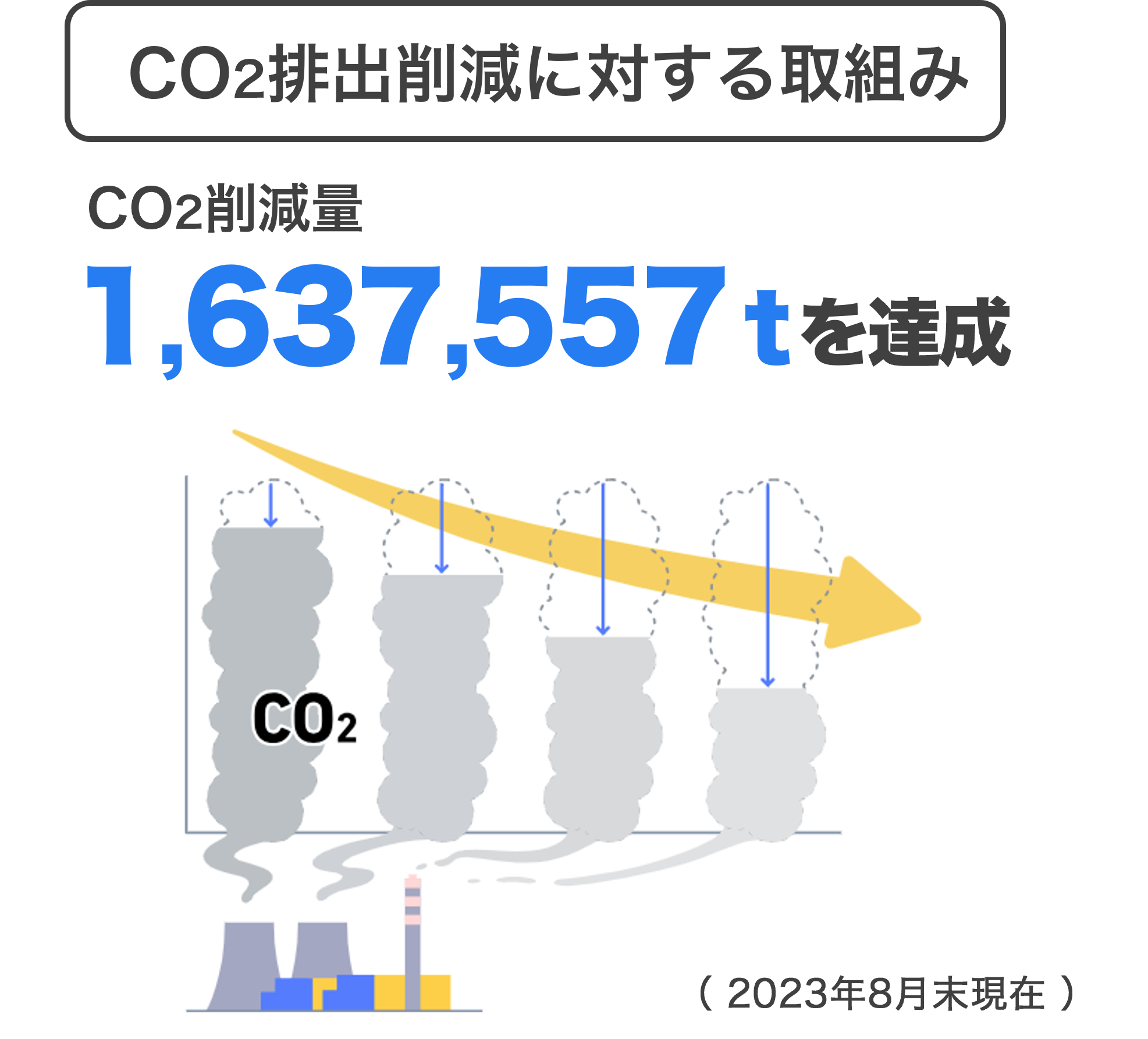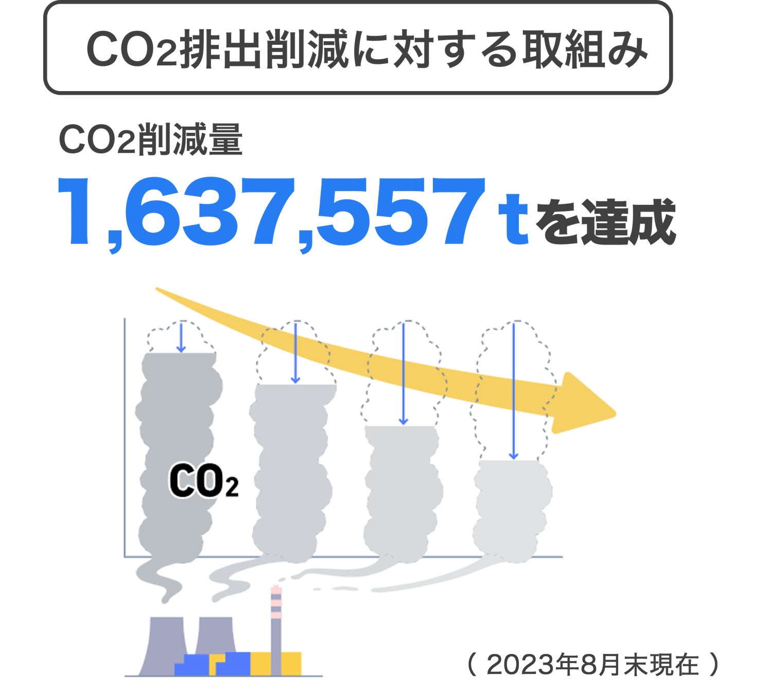「ネクシィーズZERO」による設備導入支援件数は2023年8月末時点で95,818件にのぼり、設備導入による電力削減効果を転換したCO₂排出削減量は累計1,637,557tに到達しています。