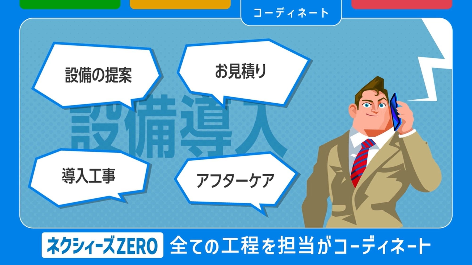 動画では、設備導入における悩みを4つのサービスで解決するという「ネクシィーズZERO」の特徴を、個人事業主や会社経営者と公式キャラクター「ネクゼロマン®」との掛け合いにより、親しみやすく、インパクトのある内容を3分間で表現しております。