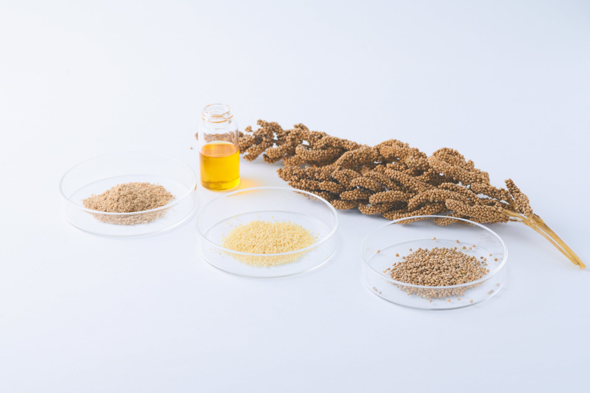 地域の特産品由来の未利用資源を活用したアップサイクル原料にも取り組んでおります。一例となるヒエヌカオイルは、ファーメンステーションが岩手県のJA関連会社や研究機関とともに独自の圧搾・精製方法で開発した稀少なオイルです。岩手県が日本一の生産を誇る雑穀「ヒエ」は健康食品として注目を集める一方、精製の過程の副産物である『ヒエヌカ』は畑の肥料や家畜飼料に混ぜる以外は用途がない未利用資源でした。ヒエヌカオイルはルテイン、ゼアキサンチン、ビタミンE、リノール酸といった美容成分を含む天然素材です。本原料は、国際的なオーガニック認証であるエコサートCOSMOS認証の登録原料として、認証取得商品において活用可能な原料となります。