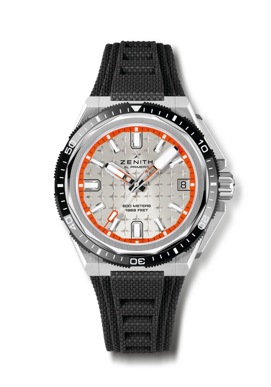 現代の「デファイ」を特徴づけるシグネチャーのひとつとして、文字盤には4つの点を結んだ星の幾何学的なパターンが描かれています。このシンボルは、1969年の「デファイ」の裏蓋とリューズで初めて用いられました。今回の新作「デファイ エクストリーム ダイバー」では特別に文字盤がシルバーホワイトで彩られ、サンバースト仕上げが12時位置のゼニススターから放射状に広がる光を表現しています。3時位置の日付表示も文字盤と同色に仕上げられています。