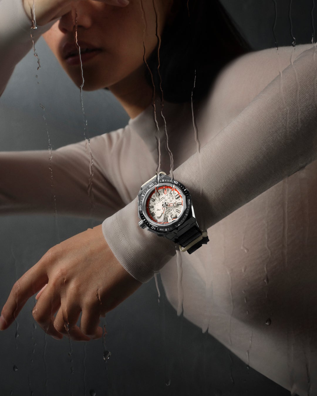 「デファイ エクストリーム ダイバー」はチタン製の3連ブレスレットに加え、交換用ストラップ2本が付属します。うち1本はブラックのFKMラバーに質感のあるコーデュラ・エフェクトが施され、水が抜けるようサイドに通気孔が設けられています。よりプロフェッショナルな用途に対応するエクストラロングストラップも付属します。漁網のアップサイクル素材を使用したこのストラップは、シングルストラップをケースの下に通してしっかりと固定できるエンドピースを備えており、ウェットスーツの上から着用できます。