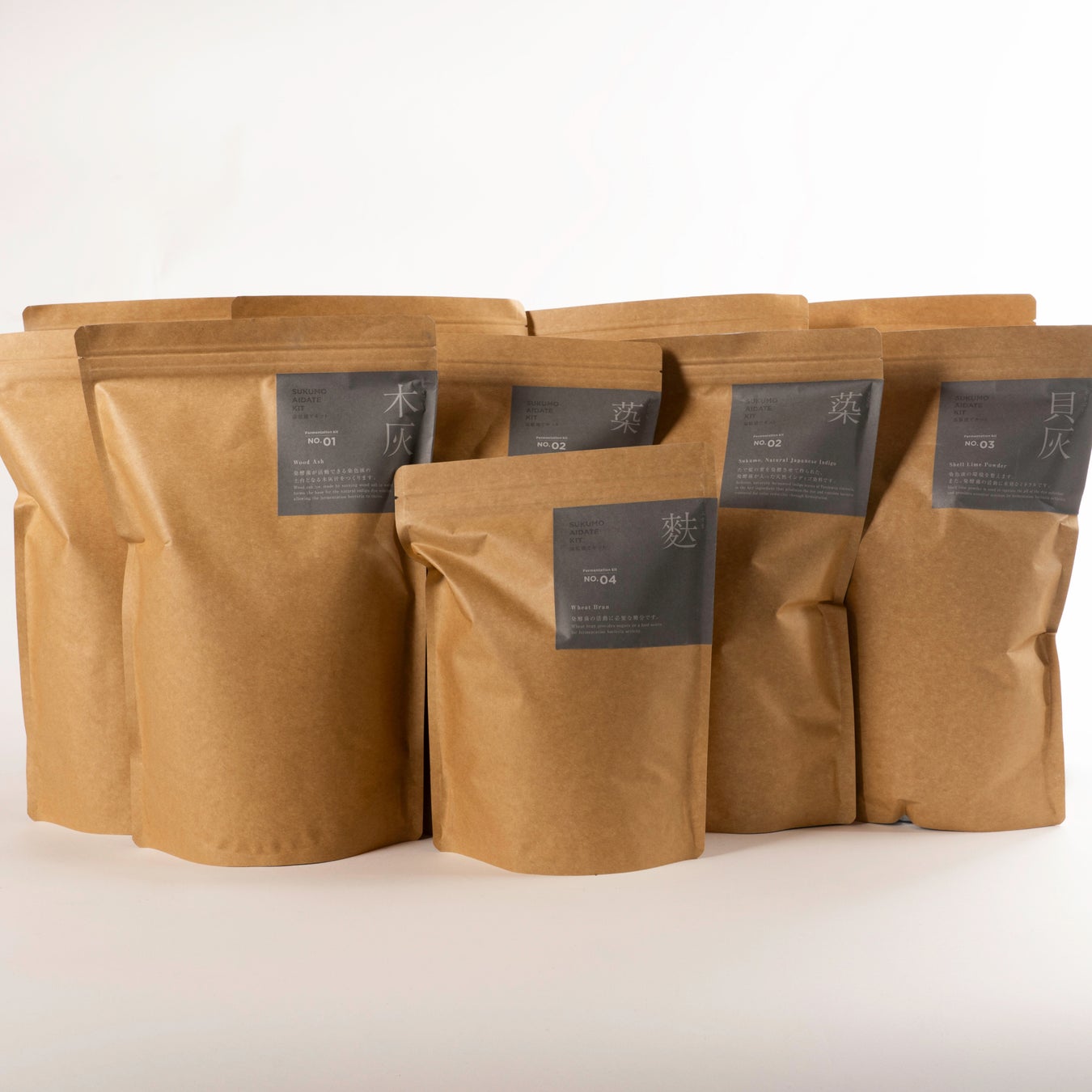 「蒅染め藍建てキット」の開発では、お客様の笑顔と商品のセカンドライフを創るだけでなく、1. 乾燥葉藍を発酵させて作る「すくも」や 発酵菌のミネラルとなる「貝灰」、発酵菌のエネルギーとなる「ふすま」発酵菌の活動する環境づくりに使用する「木灰」の調合を4年かけて何度も試すことにより、今回のキット開発に至りました。