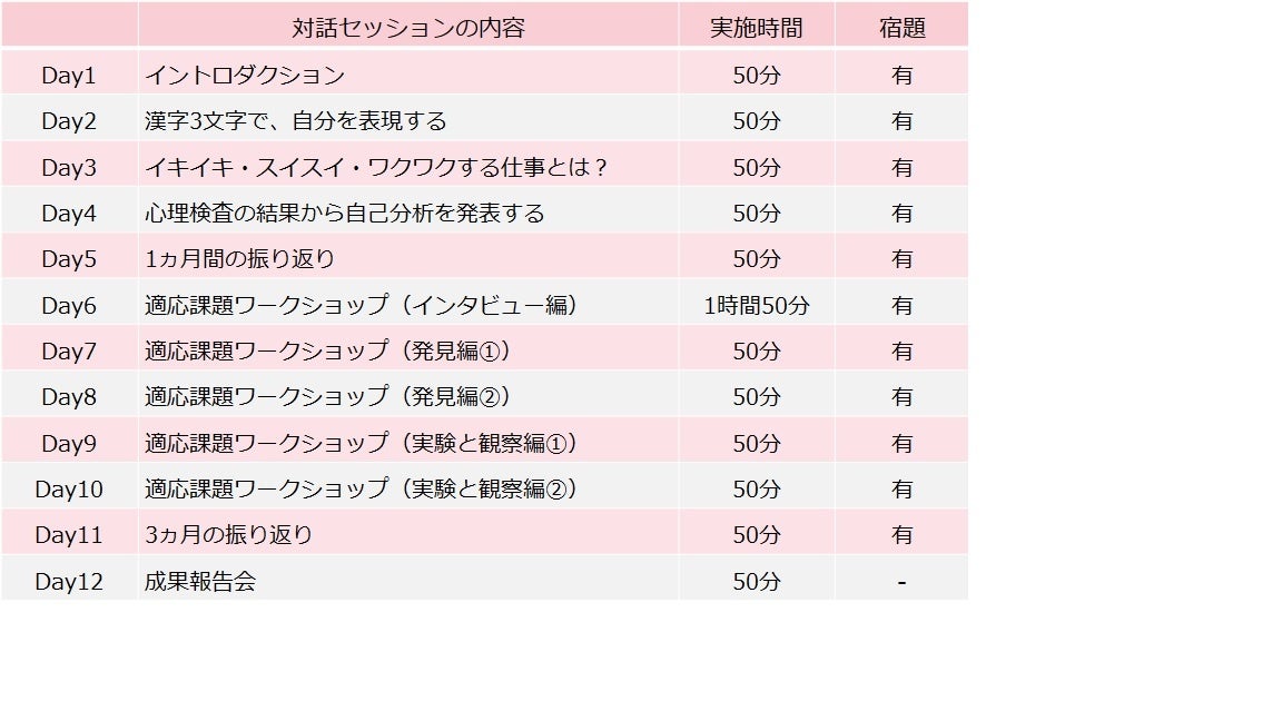 ✔50分 *×全12回(毎週1回、3ヵ月間)、1クラス8~12名、1グループ4人で実施