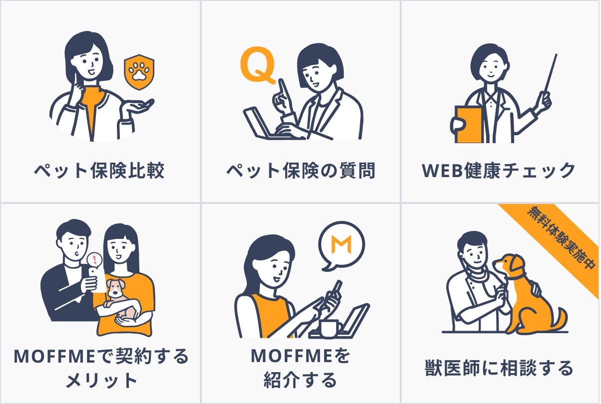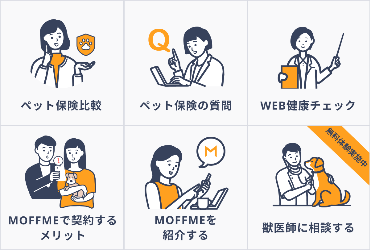 MOFFME公式サイトで対象全10社のペット保険会社から「補償タイプ・補償内容・補償割合・ペットの種類/年齢・窓口精算の有無」と様々な条件で絞り込みをしてベストなペット保険を調べることができます。