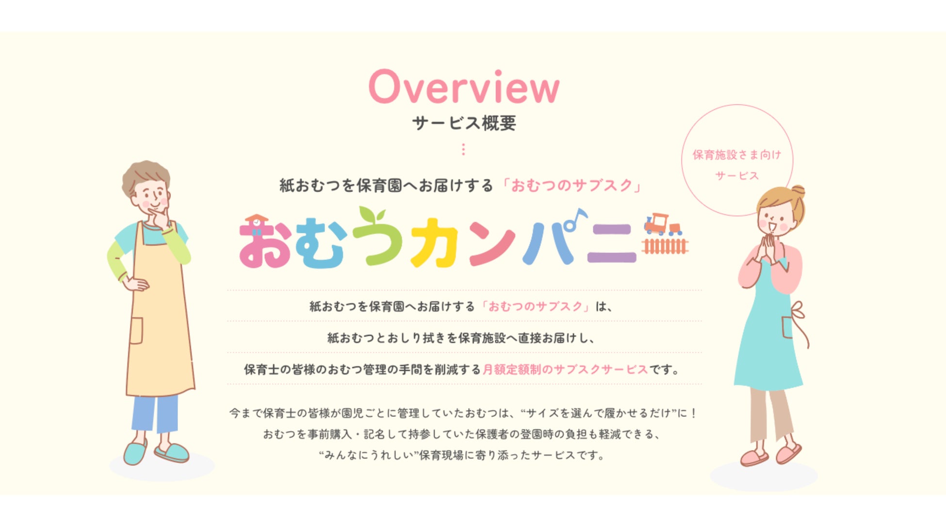 「おむつカンパニー」は、保育施設において必要とされる紙おむつを、必要な時に必要な量だけ提供するサービスです。これにより、保育施設の保育士は園児ごとの紙おむつの個別管理から解放され、より子どもたちと向き合う時間を増やすことが可能になります。また、保護者にとっても、毎日の紙おむつの準備や持ち運びの手間が省け、忙しい日々の中で少しでも負担を軽減することができます。