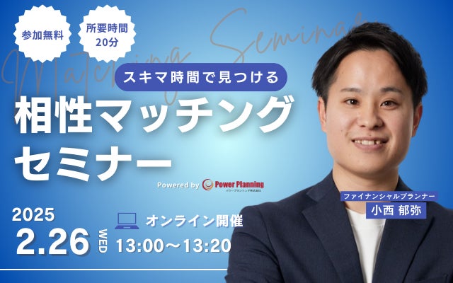 無料マネーセミナー提供サービス「アットセミナー」を運営しているパワープランニング株式会社が「2月26日(水) 13時」に「相性マッチングセミナー」というスキマ時間で自分に合ったFPを見つけられるオンラインセミナーを開催いたします。