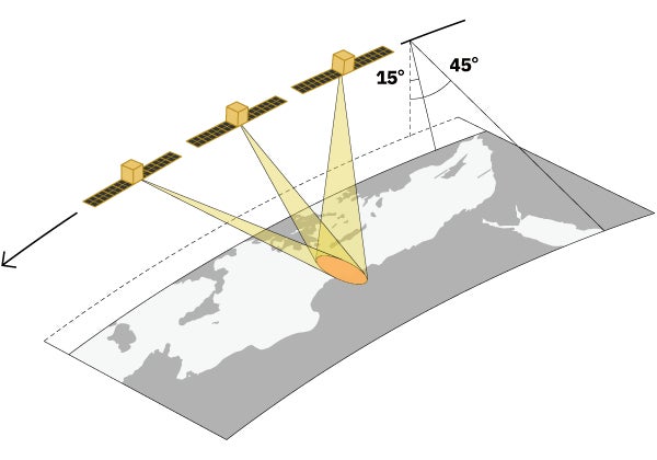 SAR画像のアジマス分解能は、電波の照射時間とドップラー帯域幅に比例します。このモードでは、アンテナビームをストリップマップモードより遅く走査することで、電波をより長い時間、地表の特定箇所に照射します。