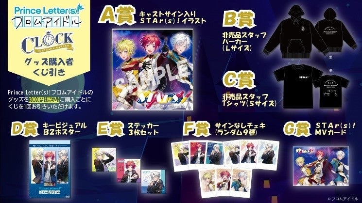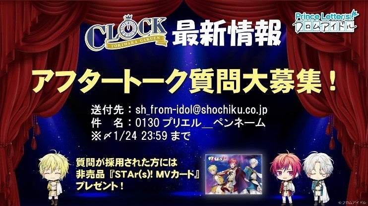 現在『Prince Letter(s)! フロムアイドル』の公式Twitter(https://twitter.com/prince_letters)では、1月30日に開催される「『Prince Letter(s)! フロムyuzu』ストーリーライブ ~私立常和歌学園 舞台「CLOCK」~」の最新情報を毎日午前の0時に公開しております。今回の「CLOCK」では、アフタートークのゲストとしてボイスドラマ『Prince Letter(s)! フロムyuzu』に桾沢リン役で出演している室元気が出演することが決定いたしました。アフタートークは、制服のキービジュアルのジャケットを身にまとって登壇する予定です。胸には「私立常和歌学園」のエンブレムがあしらわれたこだわりの一着になっておりますので、ぜひお楽しみに。1月24日(月)23:59まで質問コーナーで実際にお答えするご質問を大募集しております。何か聞いてみたいことがありましたら「sh_from-idol@shochiku.co.jp」までメールをお送りください。また、会場にお越しいただいた皆さまにはオリジナルリーフレットの配布を行うことも決定しました。会場物販で3000円ご購入ごとにくじ引きがひけるキャンペーンも実施いたしますので、ぜひ会場まで足をお運びください。