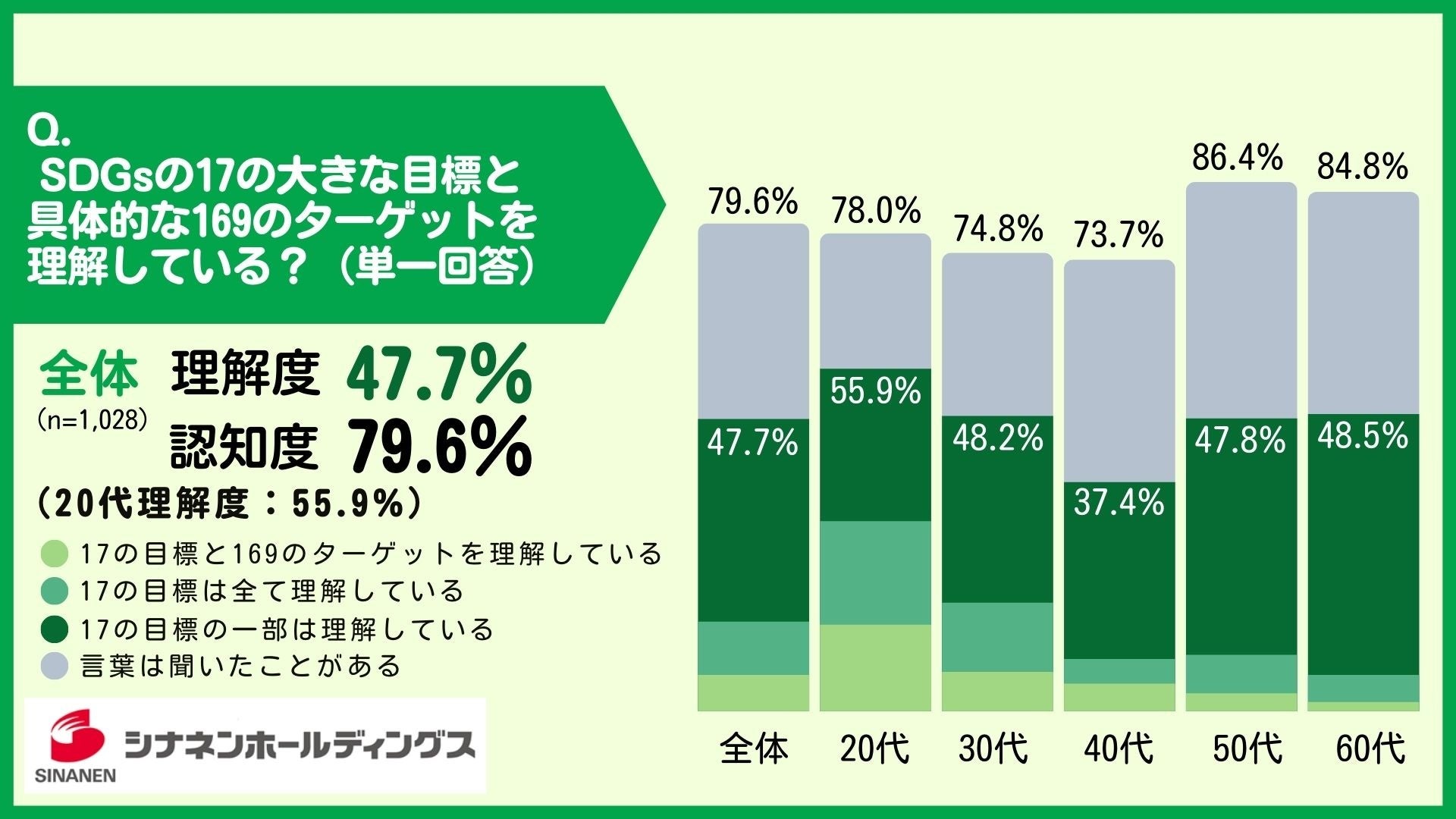 ・環境問題とも深く関わるSDGsの認知度は79.6%、理解度は47.7%。20代の理解度が55.9%で年代別トップ。