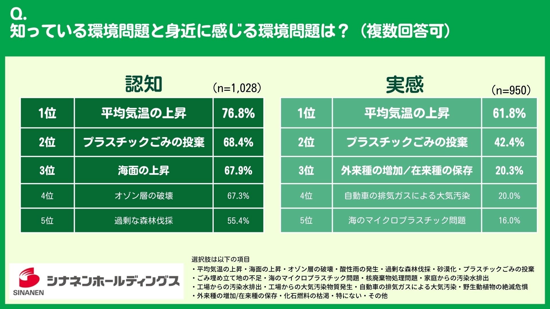 - 認知度/実感度1位の環境問題は「平均気温の上昇」