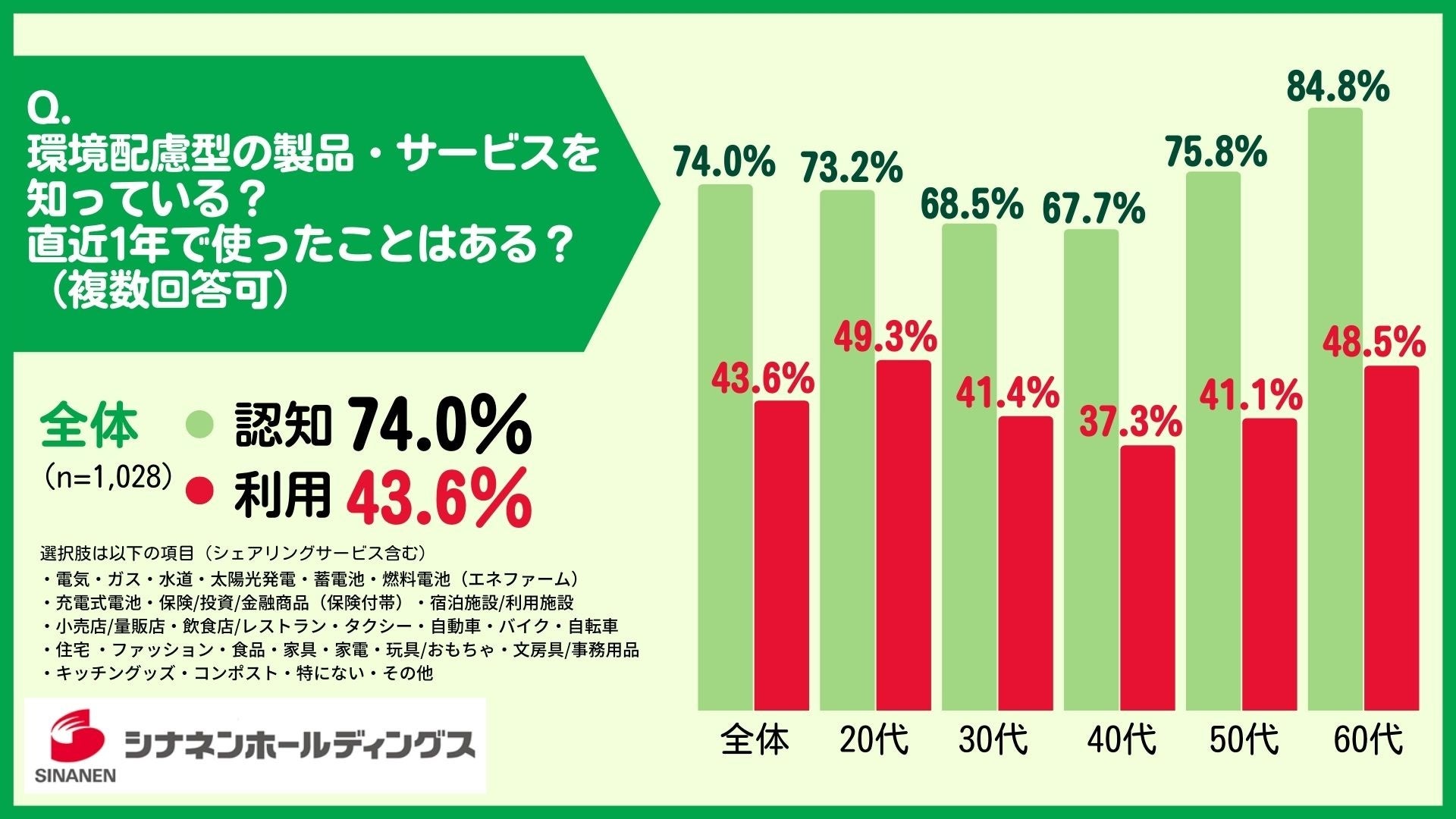 ・直近1年間に環境配慮型の製品・サービスを利用した経験があるのは全体の43.6%。全年代で5割を切る結果に。