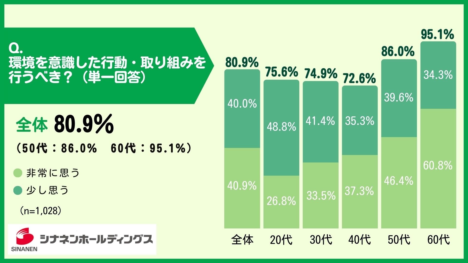 ・全体の80.9%が環境問題を意識した行動・取り組みを行うべきと回答。50代以上では9割にのぼる。