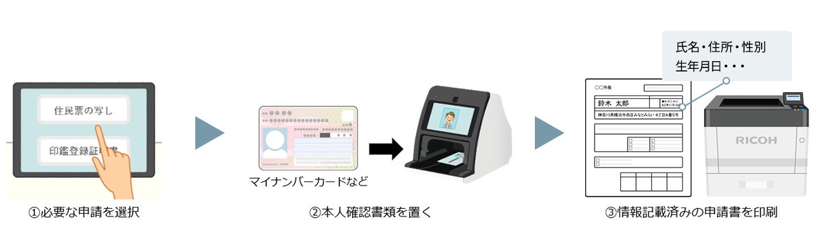 ➀申請書作成アプリケーションを搭載し、タッチ操作で各種選択を行うタブレットPC、②本人確認書類を読み取る「Caora」、③申請書を印刷するプリンターの3点の機器で構成されています(注2)。