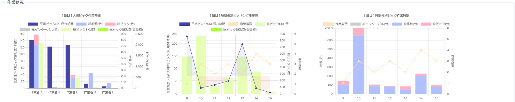 ダッシュボード機能とは、「人別の生産性可視化」「作業予実管理」「作業状況把握」「在庫充填率」「都道府県別出荷届け先状況」等が主な機能になります。