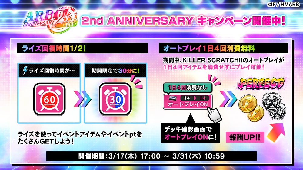 期間中、KILLER SCRATCH!!で使用できるライズの回復にかかる時間が通常の1/2になり、オートプレイが1日4回までアイテムを使用せずに利用できます。
