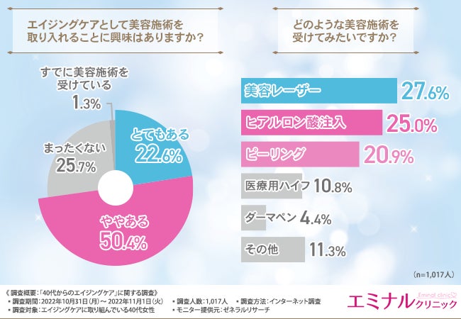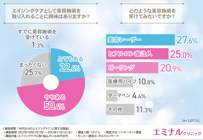 【40代からのエイジングケアに関する調査】4割近くの方が40代から始めていると回答。みんなが受けてみたい美容施術とは?