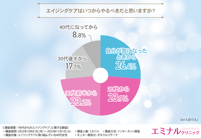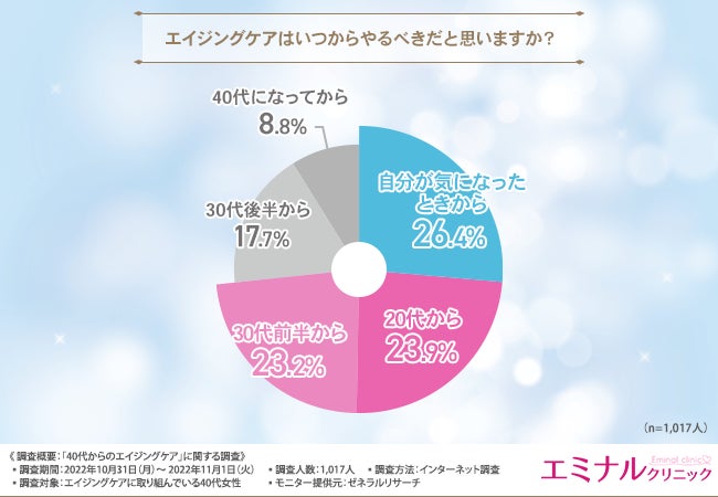 そこで、「エイジングケアはいつからやるべきだと思いますか?」と質問したところ、『自分が気になったときから(26.4%)』『20代から(23.9%)』『30代前半から(23.2%)』『30代後半から(17.7%)』『40代になってから(8.8%)』という回答結果になりました。