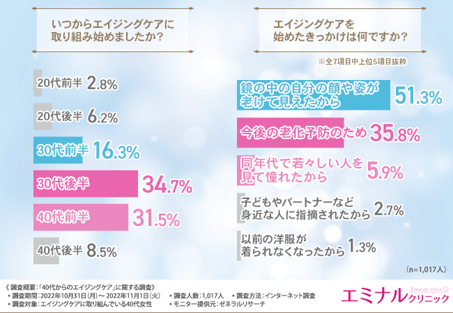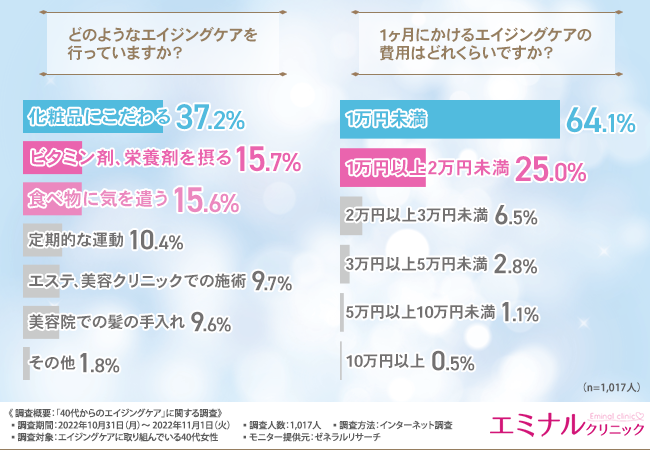 そこで今回、医療ハイフを手掛けるエミナルクリニック(https://eminal-clinic.jp/hifu/?refmedia=A-40039)は、エイジングケアに取り組んでいる40代女性を対象に、「40代からのエイジングケア」に関する調査を実施しました。