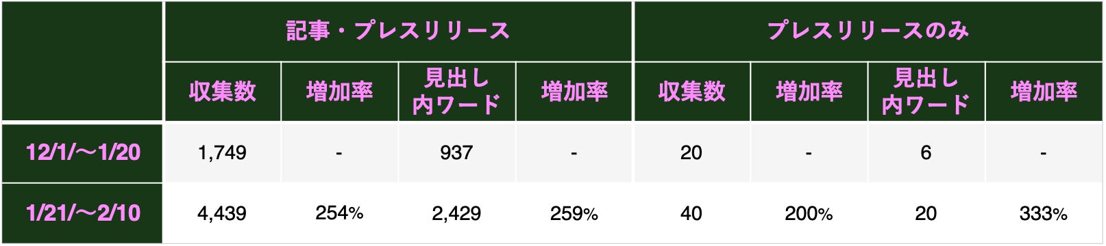 ・1月下旬以降、記事数は2.5倍、プレスリリースは2倍に