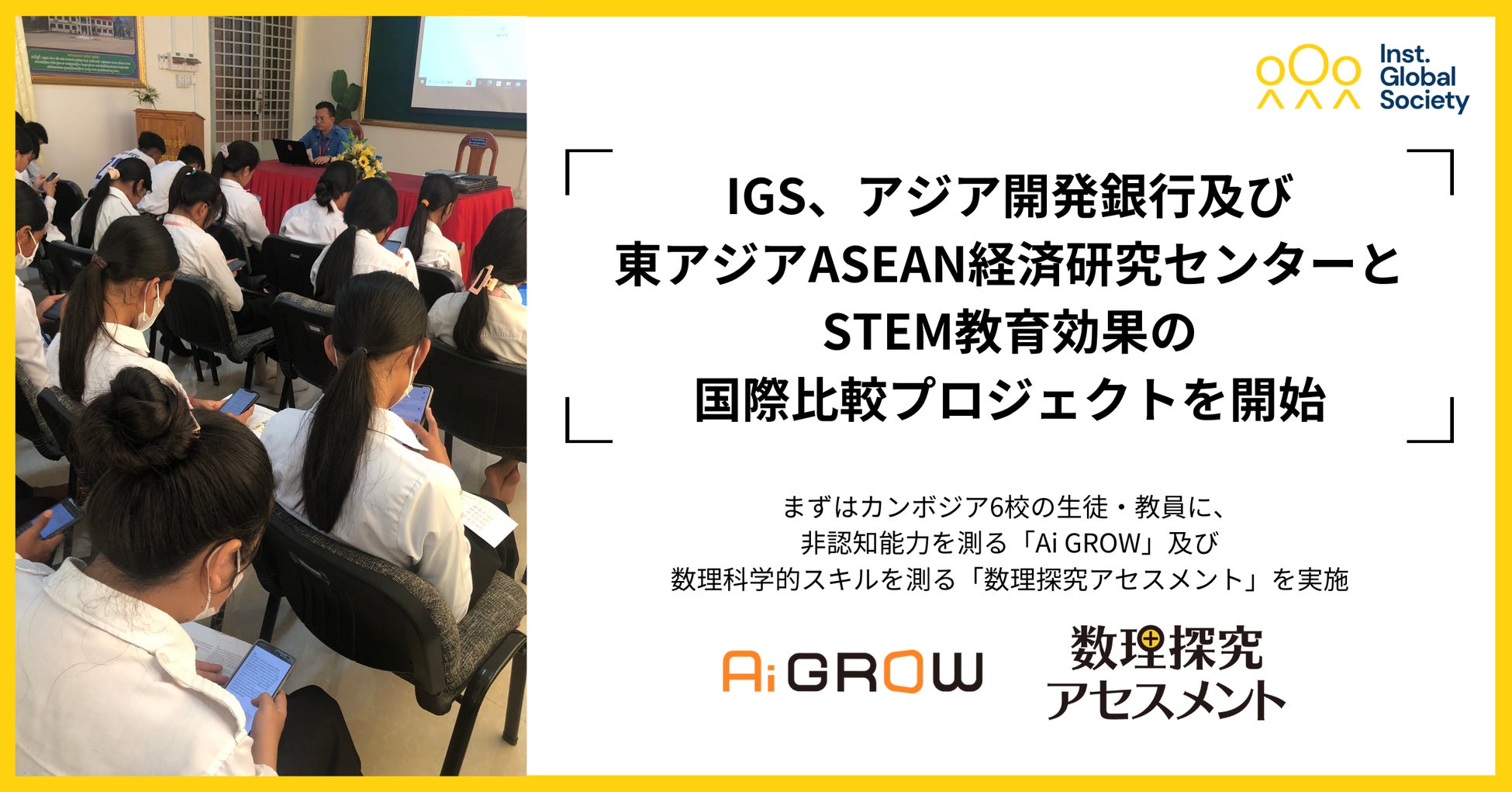 Institution for a Global Society 株式会社(本社:東京都渋谷区、代表取締役社長 COO: 中里 忍、以下「IGS」)は、アジア・太平洋地域を対象とする国際開発金融機関「アジア開発銀行」(以下「ADB」)、及び東アジア経済統合の推進に向けて政策研究・政策提言を行う国際的機関「東アジアASEAN経済研究センター」(以下「ERIA」)と、STEM教育の効果を国際比較するプロジェクトを開始しました。まずはカンボジアにおいて、カンボジア教育省の多大な協力のもと、現地の中学校3校・高等学校3校で、生徒約380名・教員約70名を対象に、IGSが提供する非認知能力測定ツール「Ai GROW(アイ・グロー)」及び数理科学的なものの見方や考え方・スキルの測定ツール「数理探究アセスメント」の初回受検を9月に実施しました。