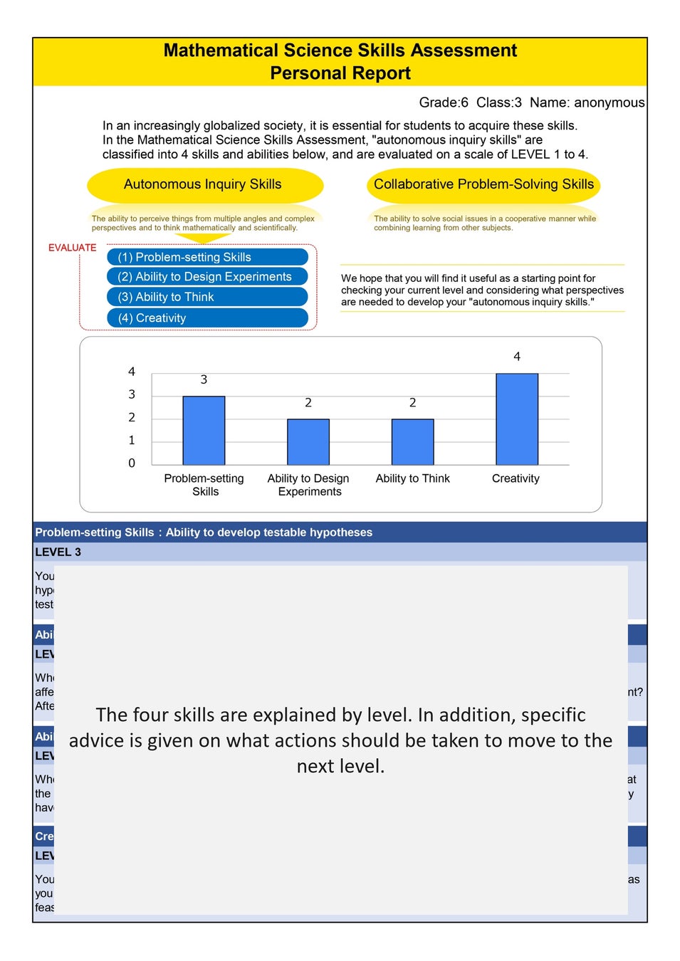 一層のデジタル化・グローバル化が進むこれからの社会では、文系・理系問わず、「数学や理科と他教科の学びをつなげ、協働して新たな知や解を創造する力=探究力」を育むことが不可欠です。その力を育むために必要な数理科学的なものの見方や考え方・スキルである「自律的探究力」を確認し、成長につなげるアセスメントとして、東京学芸大学大学院 教育学研究科 西村 圭一教授監修のもと、開発しました。本アセスメントでは、生徒が問題に回答することで、絶対評価でスコアを算出します。