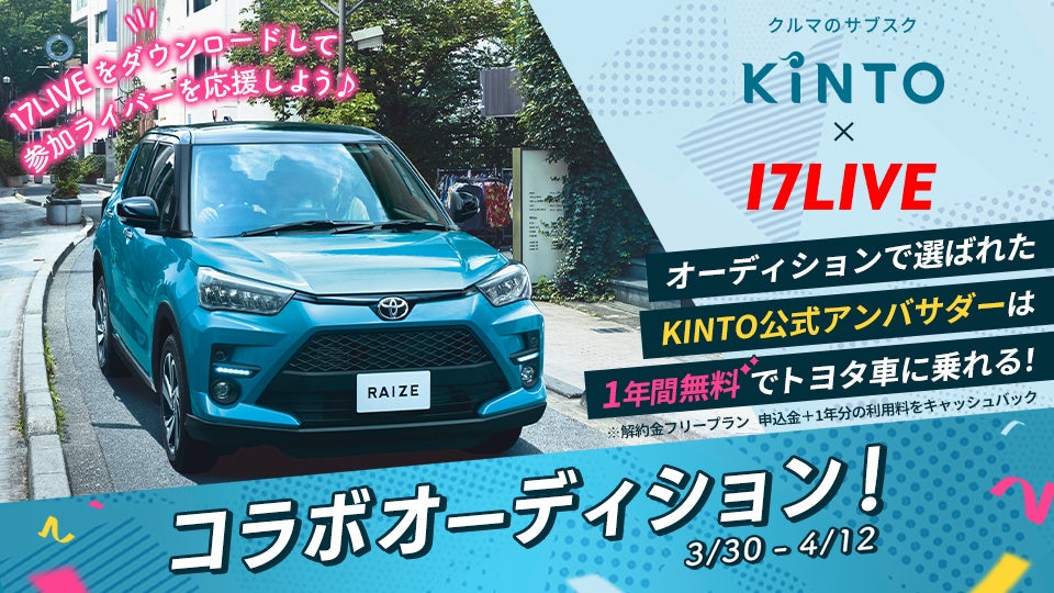 なお、「KINTO公式アンバサダー」は、ライブ配信アプリ「17LIVE」ですでに活動している方や今後活動を予定している方の中から広く選考し、そのスタートとなるオーディションを、22年3月30日(水)から22年4月12日(火)の期間に開催します。このイベントを経て最終的に公式アンバサダーに選ばれた方には、KINTOで取扱っているトヨタ車を1年間無料でお乗りいただける特典※³をプレゼントします。