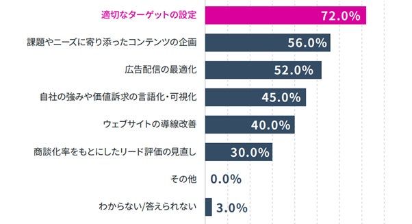 「質のいいリード」を獲得するために必要なこととして、マーケティング部門責任者の約7割が「適切なターゲット設定」と回答。さらに、半数近くが「定義の曖昧さ」や「ペルソナ設定の不十分さ」を自社の課題として認識。