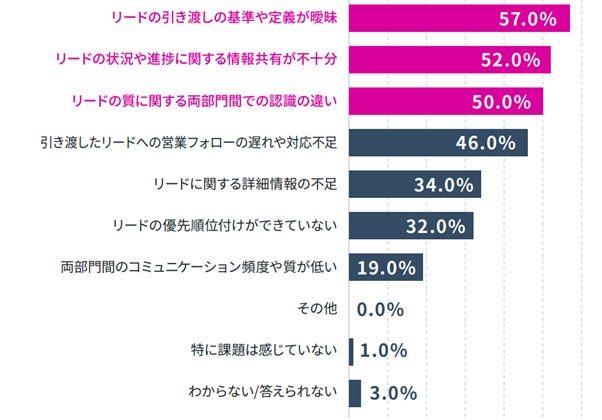 【調査レポート】マーケティング部門責任者の57.0%が、営業部門にリードを引き渡す際の課題として「引き渡しの基準や定義が曖昧」と回答