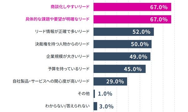 マーケティング部門責任者が考える「質のいいリード」としては、「商談化しやすいリード」「具体的な課題や要望が明確なリード」が67.0%で同率1位に。