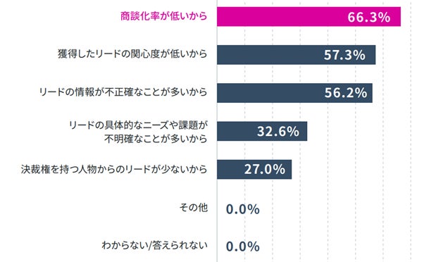 マーケティング部門責任者の約9割がリードの質に課題を感じており、そのうち約7割は「商談化率の低さ」を理由として挙げていた。