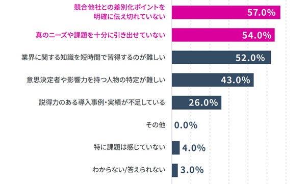 リードとの関係構築に関する課題としては、「競合との違いを明確に伝えられていない」「真のニーズや課題を十分に引き出せていない」といった声が回答者の半数以上から寄せられた。