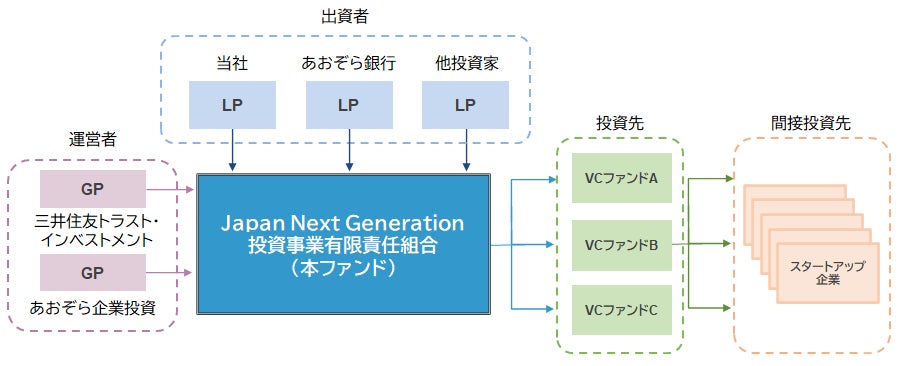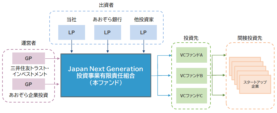 三井住友信託銀行株式会社(取締役社長:大山 一也、以下「当社」)と株式会社あおぞら銀行(代表取締役社長兼最高経営責任者(CEO):谷川 啓)、以下「あおぞら銀行」)は、三井住友トラスト・インベストメント株式会社(代表取締役:吉田 憲正)とあおぞら企業投資株式会社(代表取締役社長:久保 彰史)が組成する、新興のVCファンドを投資対象とした「Japan Next Generation投資事業有限責任組合」(以下「本ファンド」)に出資しましたのでお知らせします。