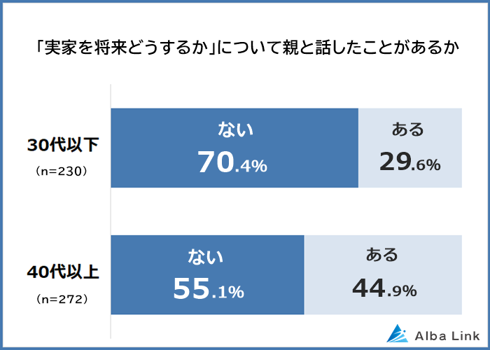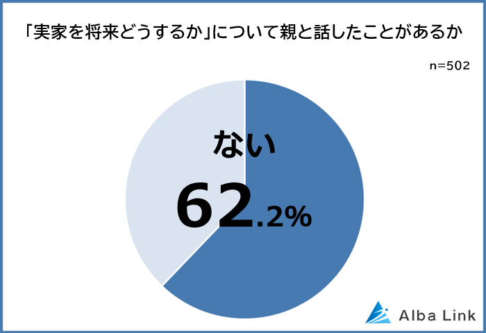 最後に、「実家を将来どうするか、親と話したことがあるか」聞いたところ、「ない」と回答した人は6割を超えました。「実家の扱いに不安を抱えつつも、親と相談したことはない」という人が多いとわかります。