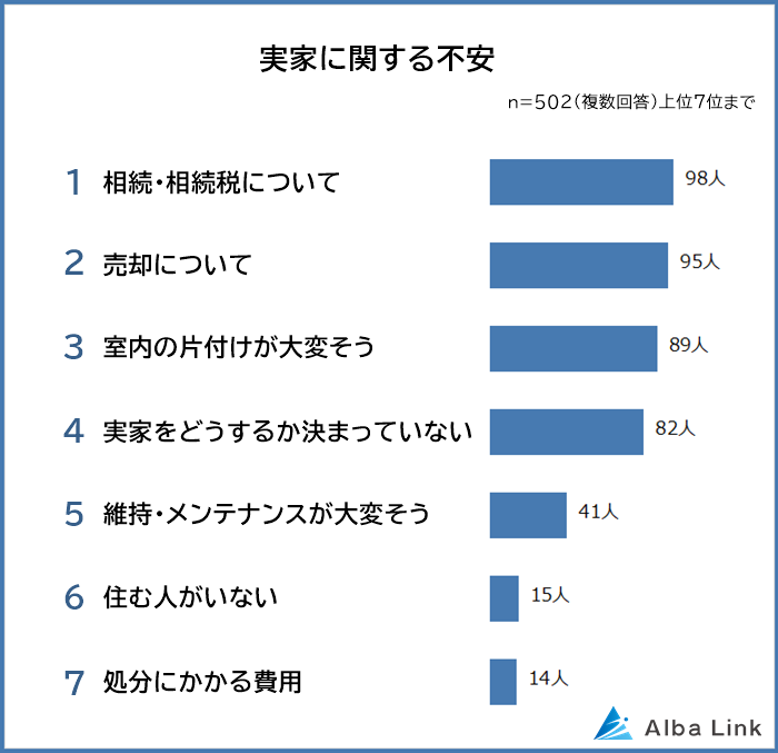 今回、株式会社AlbaLink( https://albalink.co.jp/ )が運営する訳あり物件買取プロ( https://wakearipro.com/ )は、実家がある502人を対象に「親が住んでいる家や土地に関する不安」についてアンケート調査を実施しました。