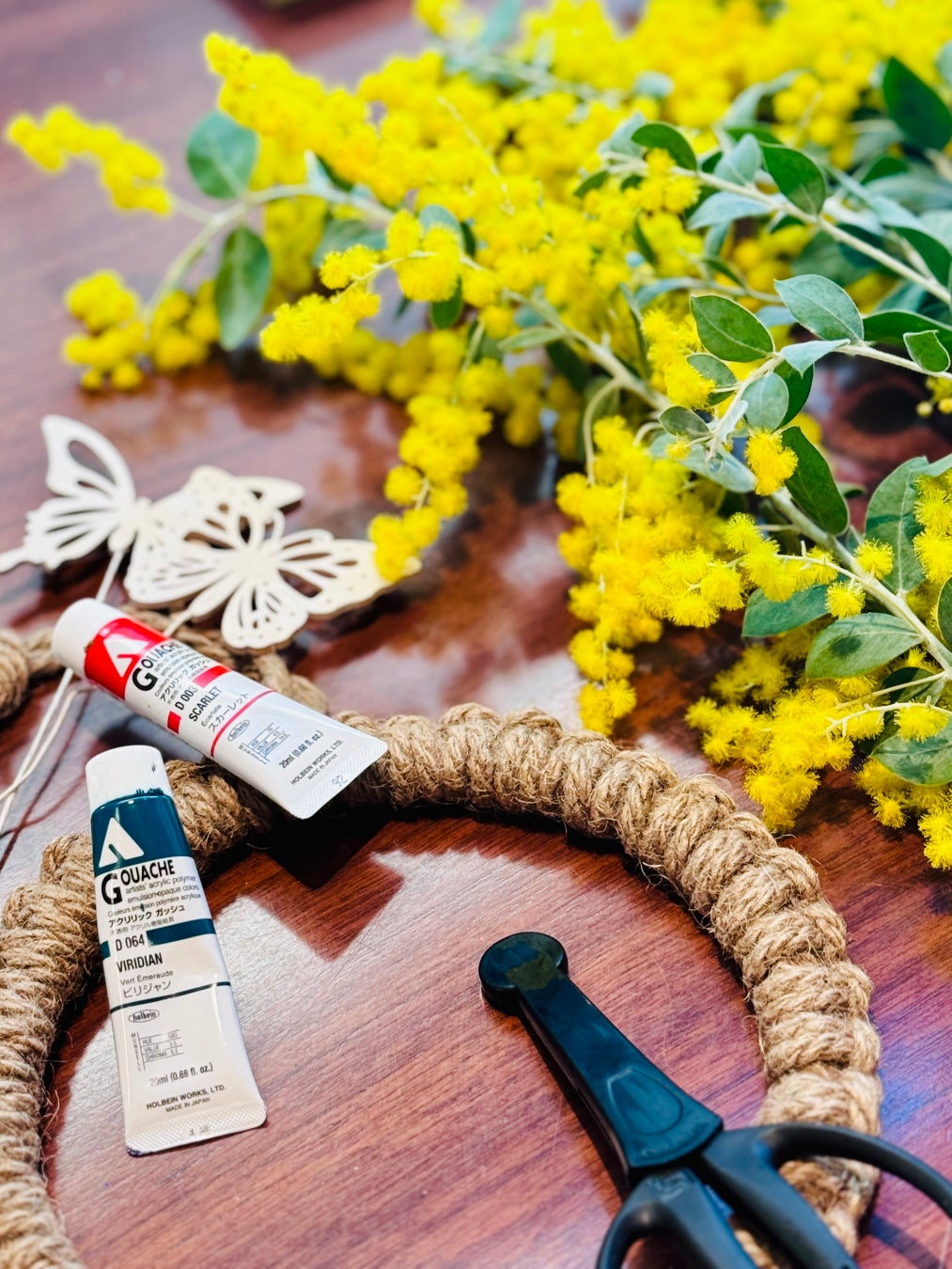 親子クラス:直径約25~30㎝を1点 *ミモザと装飾品とで、2人で1つのリースを仕上げます。